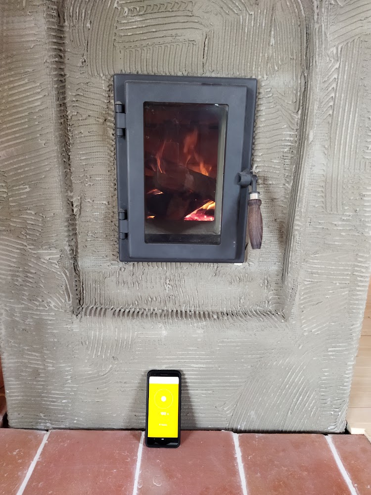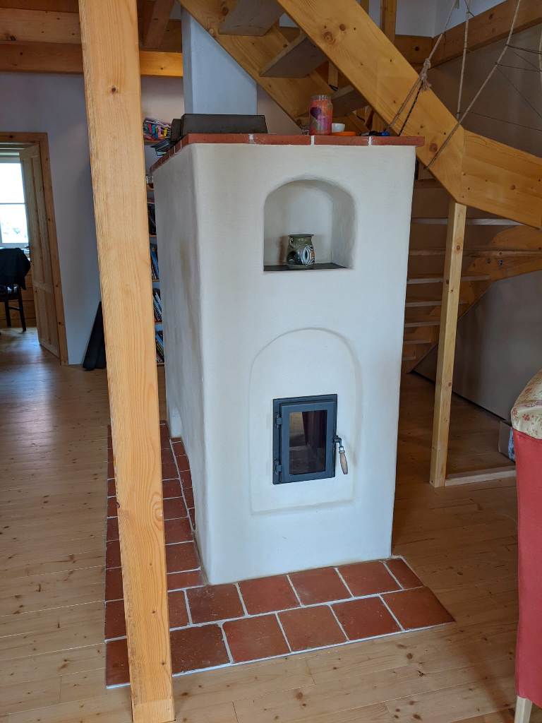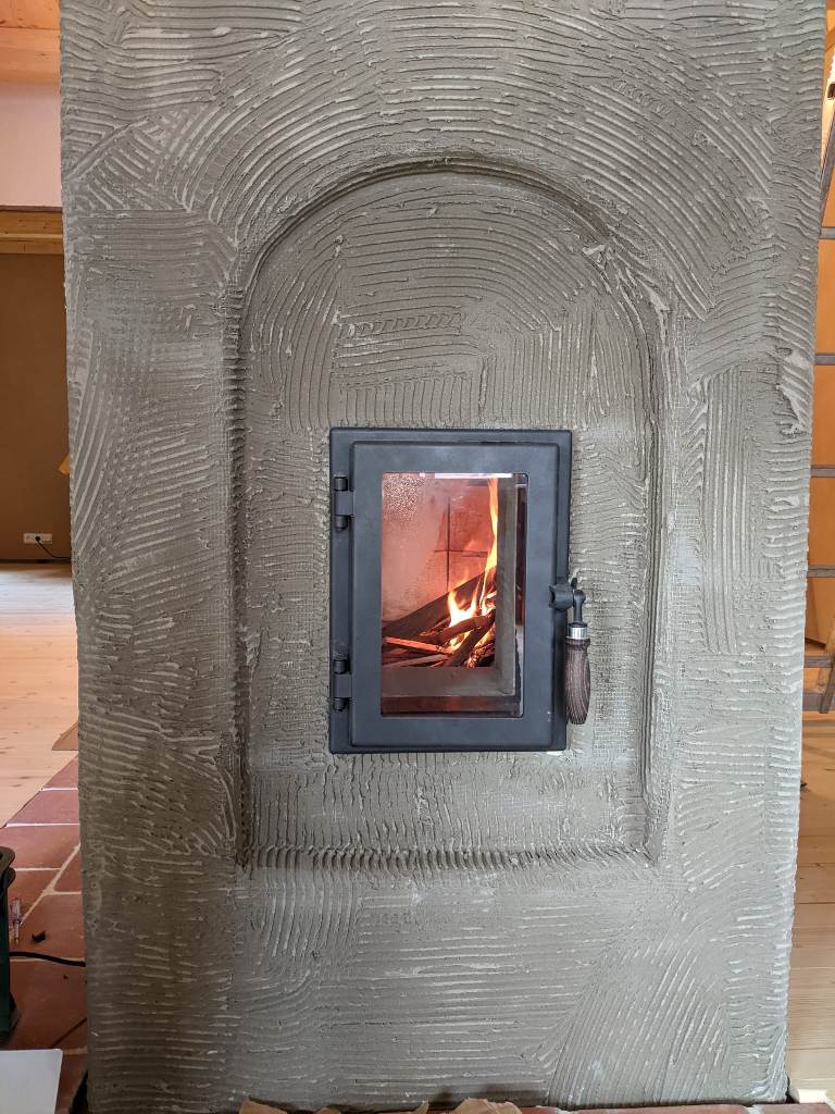 Lehká akumulační kamna s automatickou klapkou, jednoduchým prosklením, ohniště a tahovým systémem Brula, žárobetonová obestavba, lepidlo + perlinka, plotýnka na ohřev čaje. Kování: Jokr - jednosklo; přívod vzduchu řešen regulací Timpex