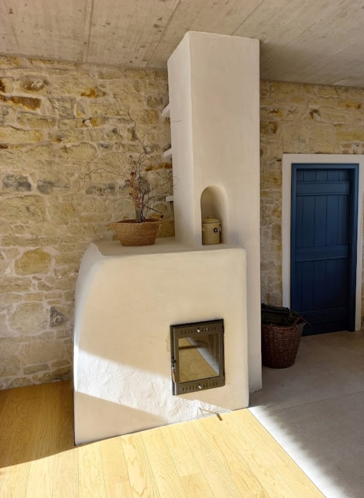 Hlavní stěna v interiéru obývací pokoje a kuchyně je vlastně současně obnaženou zdí staré opukové stodoly, a na této stěně by se nám právě tato menší omítaná kamna líbila. Nechceme kachle, ale hladkou “nerovně zvlněnou” ruční omítku se zaoblenými rohy a hranami. Vložku co nejlepší, nebráním se ani stavěnému topeništi, ale bojím se výměny prasklých kamenů (rozbití půlky kamen ?) Litinové vložky brunner mi byly doporučeny. Komín by prošel zdí do stodoly a pak by šel nahoru štítem až ke hřebeni. Myslel sem na lehký montovaný ocelový.