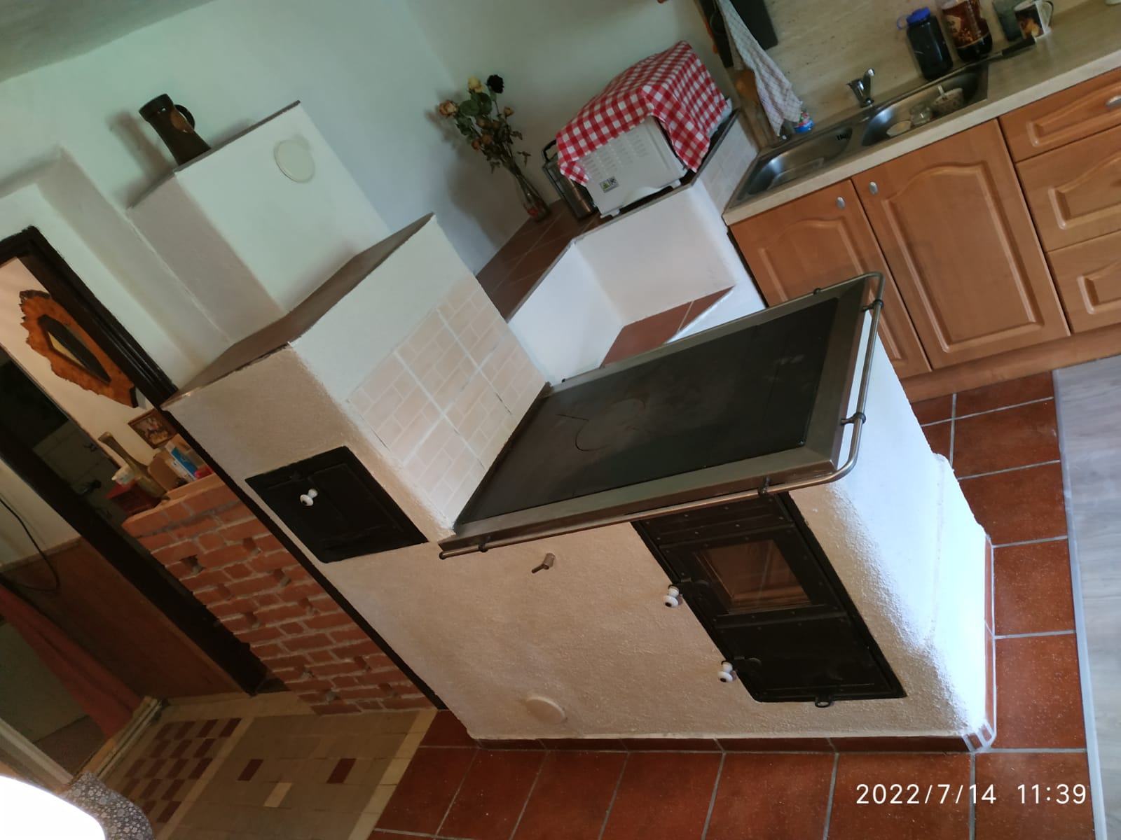 Akumulační sporák o váze 1 tuny s velmi účinným biotopeništěm a pečící troubou má dvě spalinové cesty - první na vaření + pečení, druhá akumulační pro delší výhřevnost. Ke sporáku je přizděno nevyhřívané ležení. Plášť sporáku je omítaný. Na koncové zakončení byly použity klasické dlaždice.