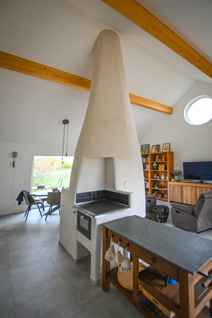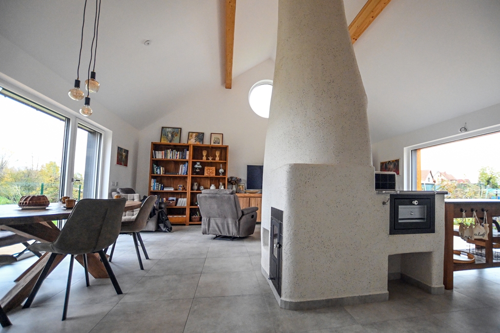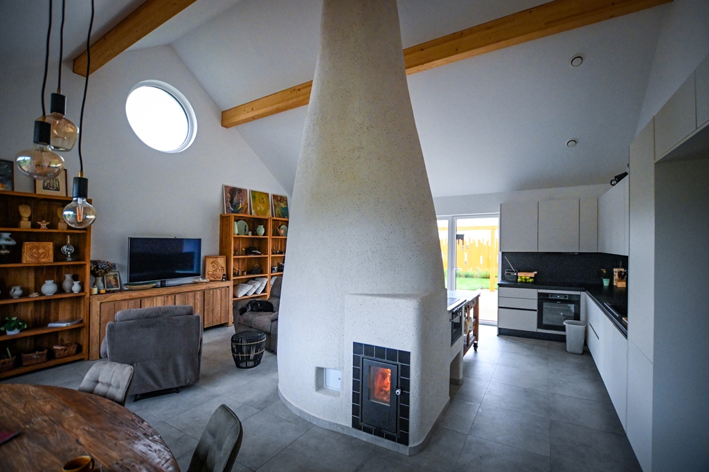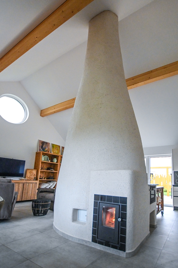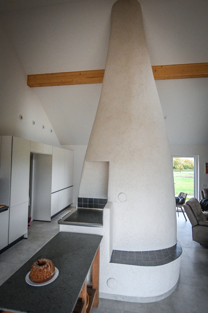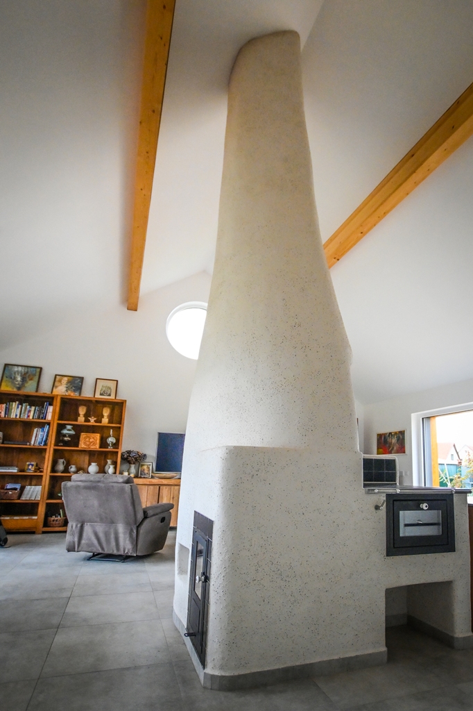 Akumulační sporák s přepínáním do dvou okruhů: pro tepelnou úpravu potravin a pro akumulaci. Izolované biotopeniště + systémové tahy Brula, dvířka Jokr Exter dvojsklo, vyhřívaná lavice, plotna s pečící trobou, akumulační sloup stavěný z žárobetonových desek o tl. 3 cm a omítaný hlínou.