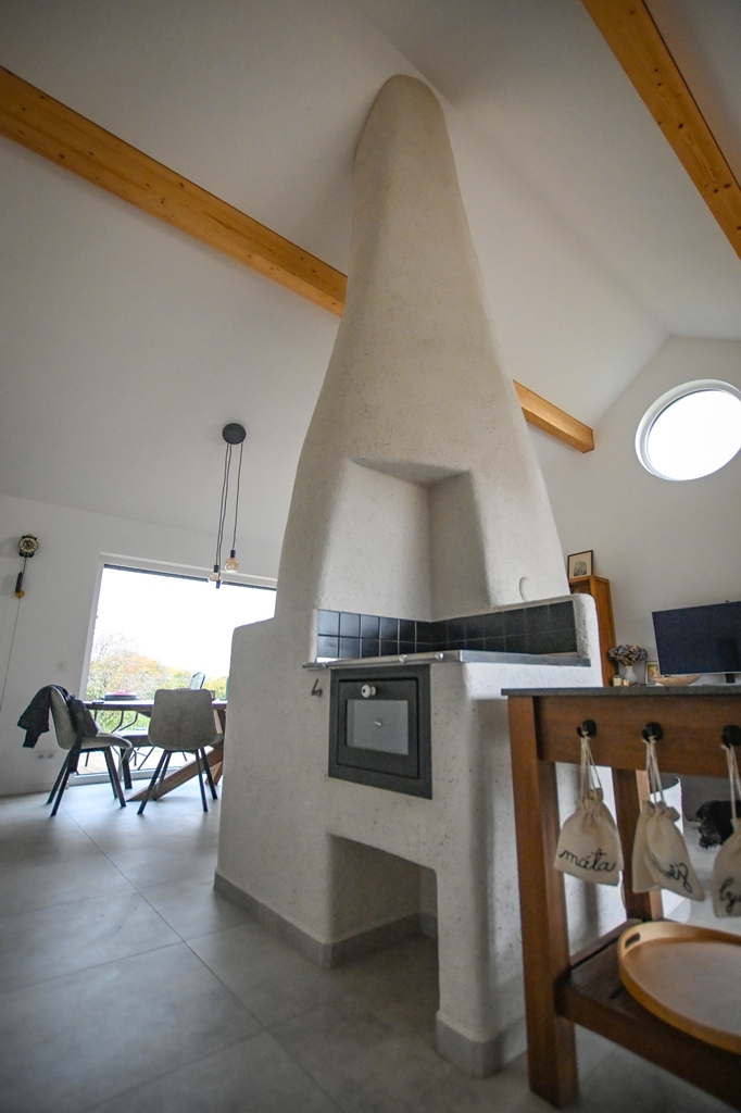 Jak stále nedává můj kolega Lukáš, stavba kamen je velká dřina????. Ale výsledek nakonec stojí za to. Akumulační sporák ve tvaru lahve s plotnou na vaření, prosklenou pečící troubou a vyhřívanou lavicí je na světě. Časová náročnost 365 pracovních hodin a minimálně 20 hodin strávených na projektu. Tvar jsme medelovali přesně podle počítače, provázku, metru i papírového kartonu. Nakonec přišla do hry hlína, kamínky, pálená keramika, a to vše dalo stavbě výjimečný a především nikdy nekoukatelný rozměr.